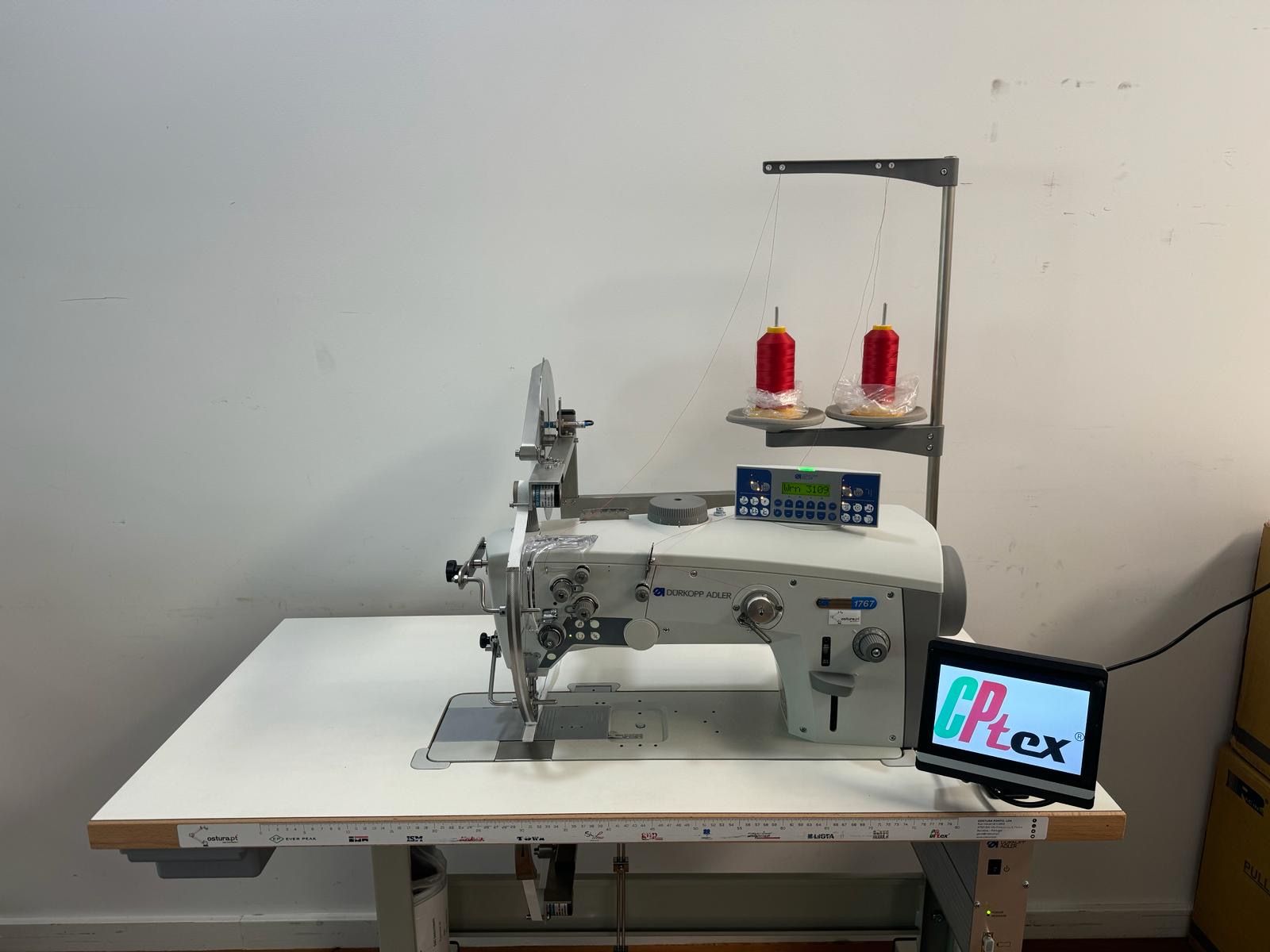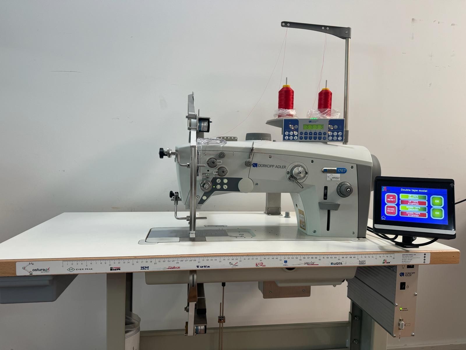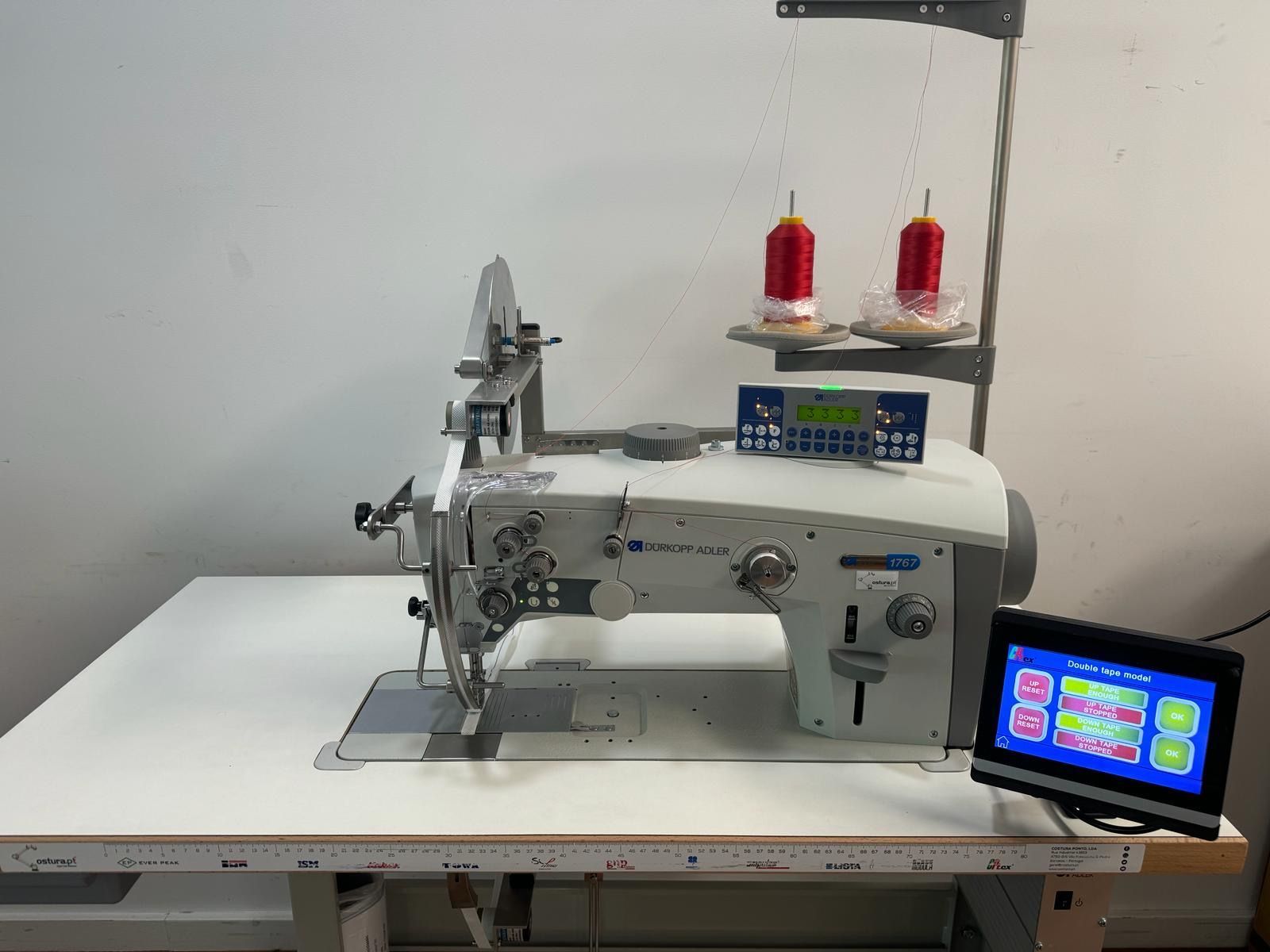 Maquina de costura Durkopp 1767 com suporte de rolos electrónico para dois rolos superior e inferior com sistema de detenção do final do rolo e de prisão e com ecrã táctil CPTex by ZF