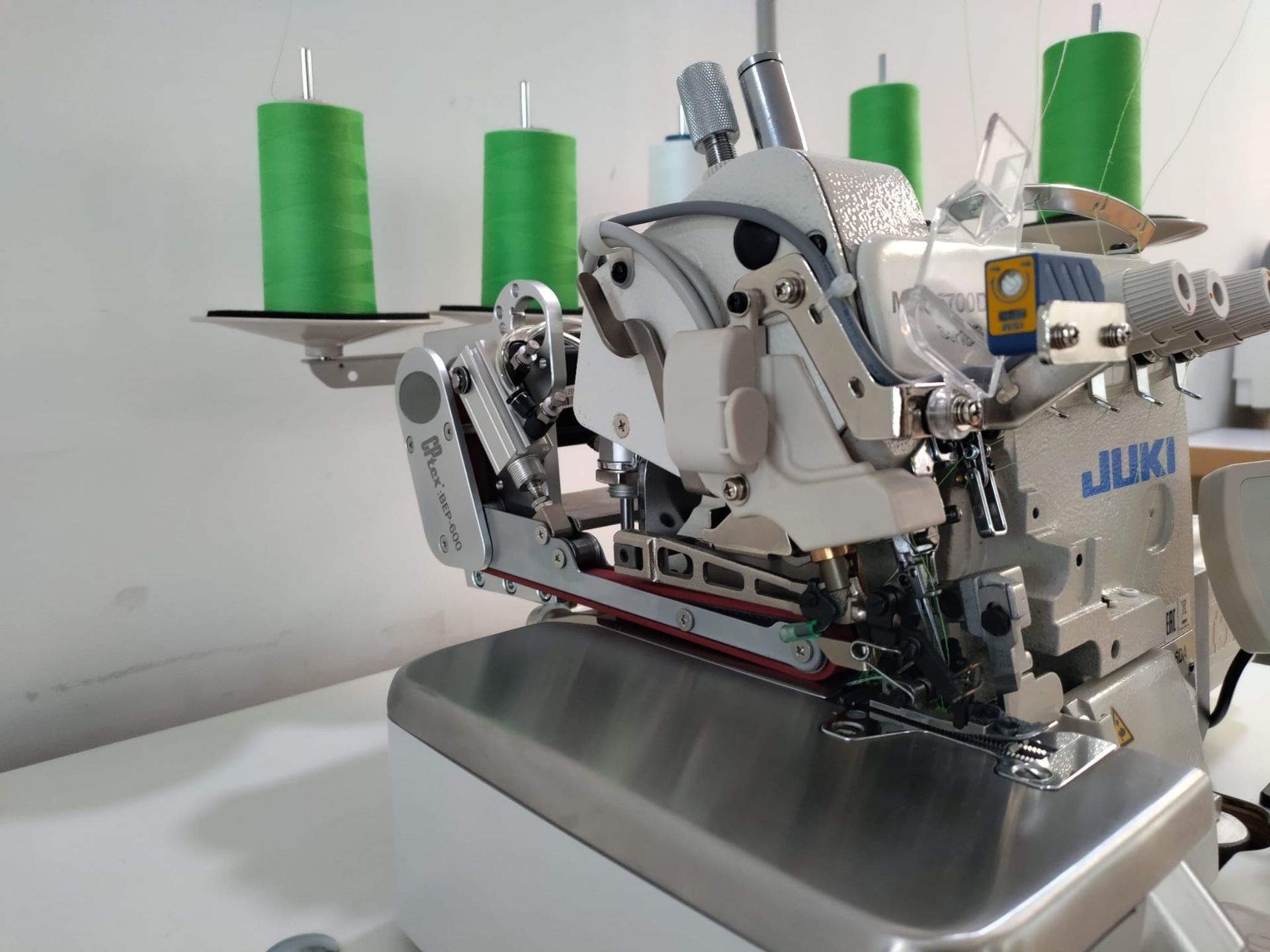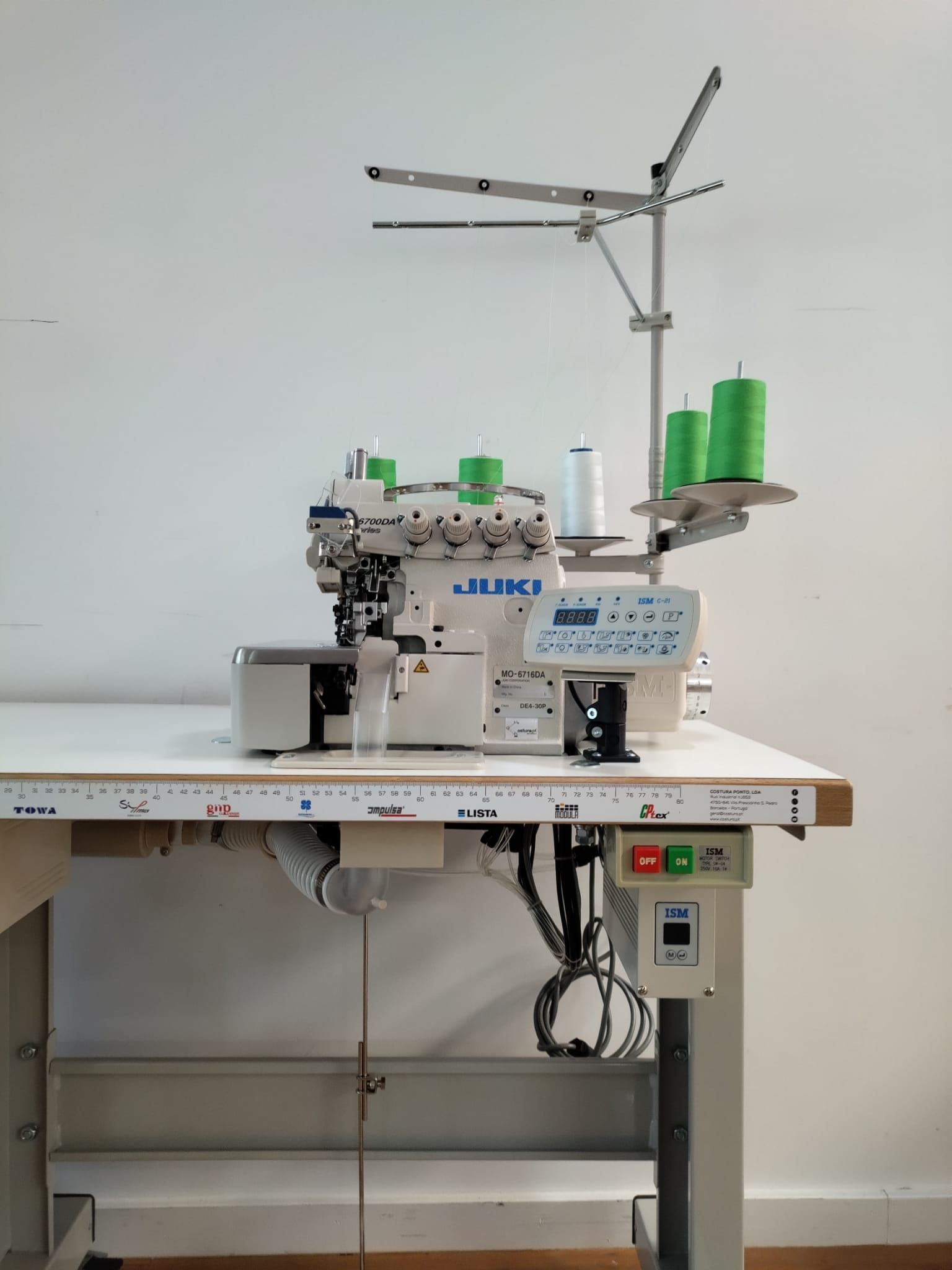 Maquina de costura Juki MO6714DA , com puller eletrónico, motor servo, corte de guilhotina, aspiração de desperdício e de linhas, tampo e estante nacional